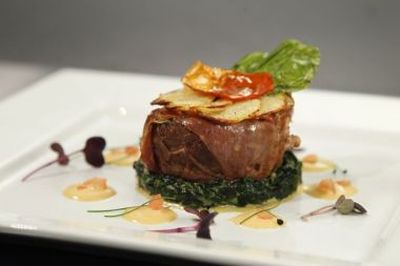 – Muschiul de vita se da cu piper, apoi se imbraca in felii foarte subtitri de prosciutto crudo, se pune in tigaia bine incinsa teflonata (fara ulei sau unt), se intoarce pe toate partile cat sa ia culoare