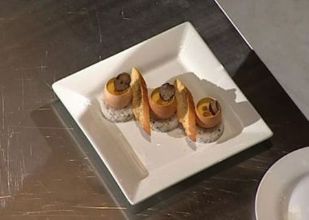 Din trufa proaspata se taie 3 felii subtiri la feliator, dupa care se taie cercuri cu forma noisette si se marineaza in ulei de masline – 3 min;